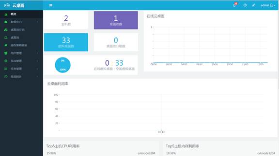 ??H3C云桌面管理平臺通過統(tǒng)一的Web管理控制臺,實現(xiàn)了對物理及虛擬資源的集中管理、統(tǒng)一監(jiān)控,通過DashBoard界面,可以進行云資源的概覽,實現(xiàn)對數(shù)據(jù)中心集群、主機、存儲、虛擬機、及網(wǎng)絡(luò)等資源的統(tǒng)一監(jiān)控。目前包括主機CPU、內(nèi)存等Top5監(jiān)控、虛擬機CPU、內(nèi)存等資源的Top5監(jiān)控。