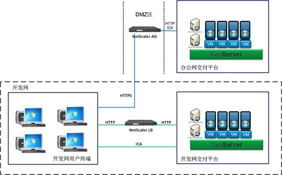 用戶終端不直接訪問任何業務網段,各種業務網段都需要通過思杰虛擬化交付平臺訪問,由思杰虛擬化交付平臺實現各業務網段的邏輯隔離。Netscaler作為安全隔離設備,放置于不同業務網段之間,提供額外的安全性增強。